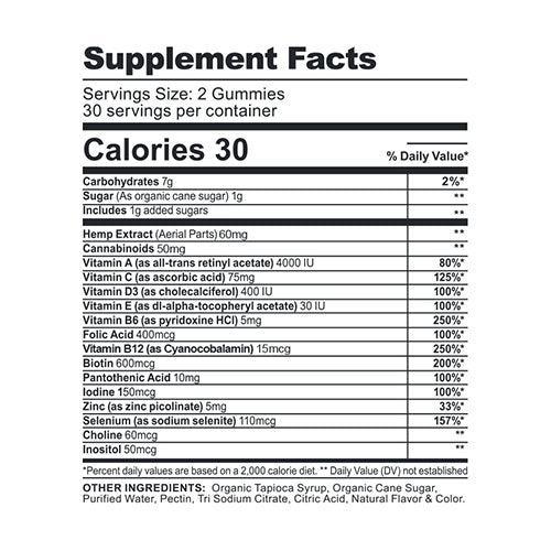 Encouraging healthy immune function while reducing inflammation, these high-quality gummies help to maintain your body’s key functions for better, lasting health. Organically-sourced CBD with an array of essential nutrients, including vitamins A, C, D3, E, B Complex, Pantothenic Acid, Choline, and Zinc.